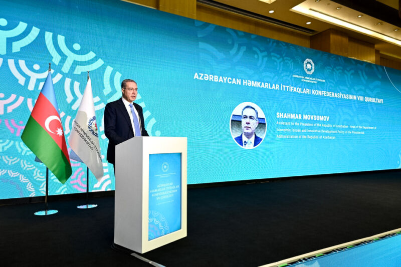 Azərbaycan Respublikası Prezidentinin köməkçisi – Prezident Administrasiyasının İqtisadi məsələlər və innovativ inkişaf siyasəti şöbəsinin müdiri Şahmar Mövsümov dövlətimizin başçısı İlham Əliyevin Qurultay iştirakçılarına müraciətini səsləndirib.
