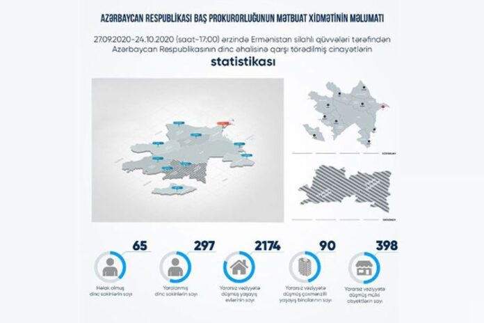 Baş Prokurorluğun mətbuat xidmətindən Türk.az-a verilən məlumata görə, sentyabrın 27-dən hazırkı vaxtadək ermənilərin yaşayış məntəqələrini atəşə tutması nəticəsində 65 mülki şəxs həlak olub, 297 nəfər yaralanıb.