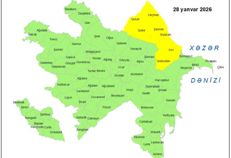 Milli Hidrometeorologiya Xidməti yanvarın 28-də bəzi bölgələrdə gözlənilən küləkli hava şəraiti ilə bağlı sarı xəbərdarlıq verib.